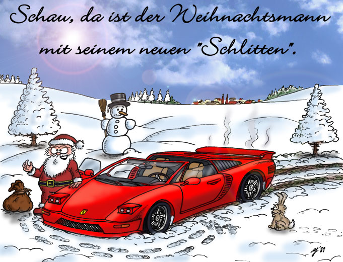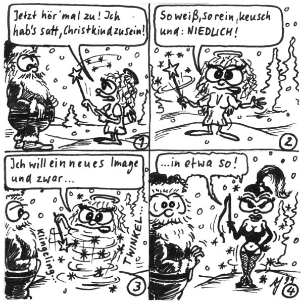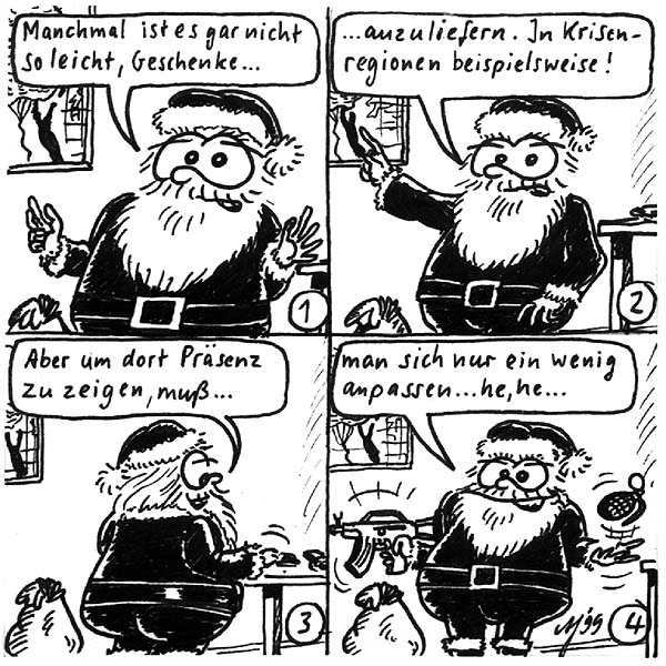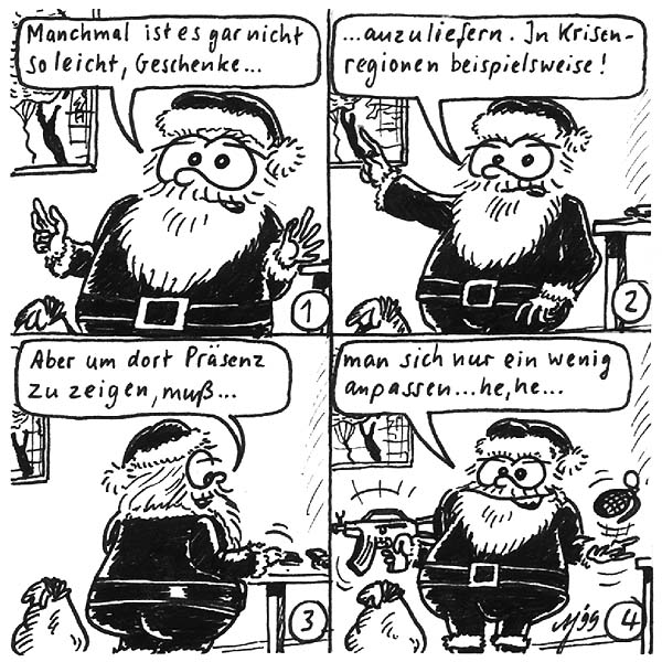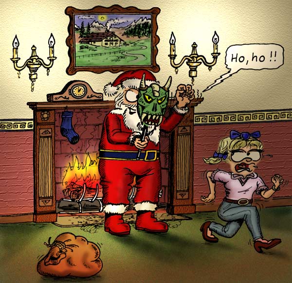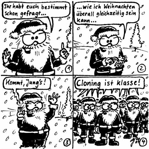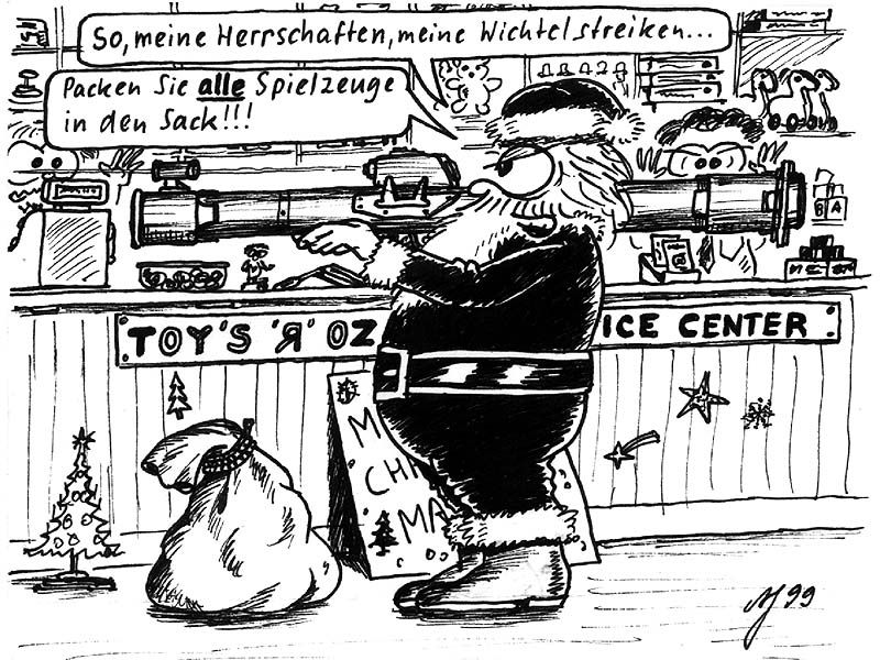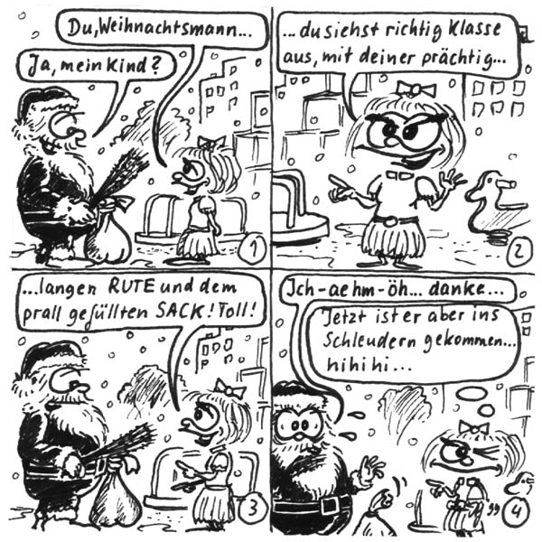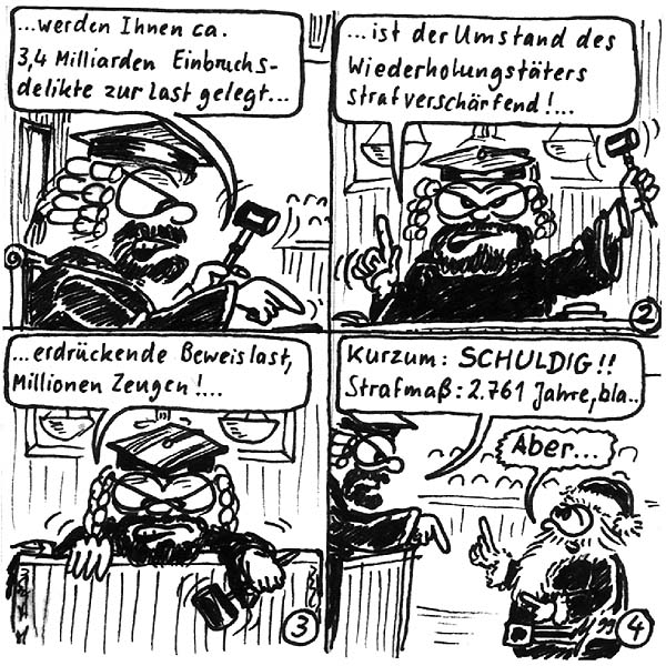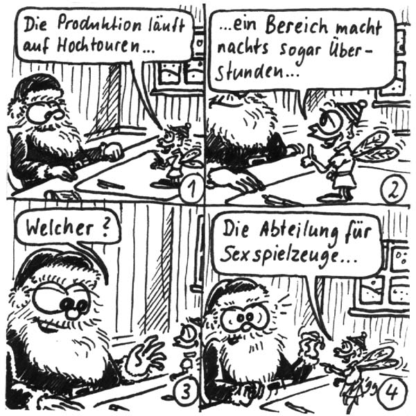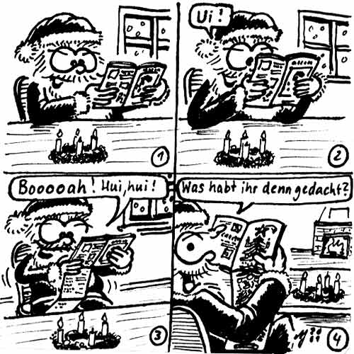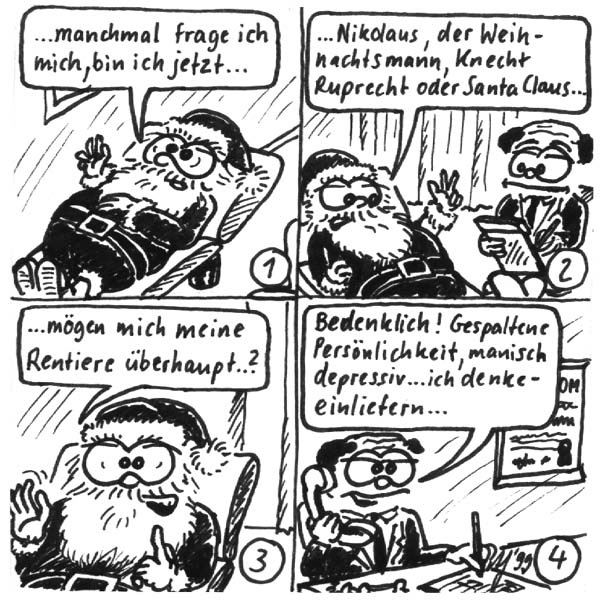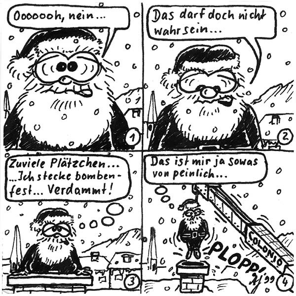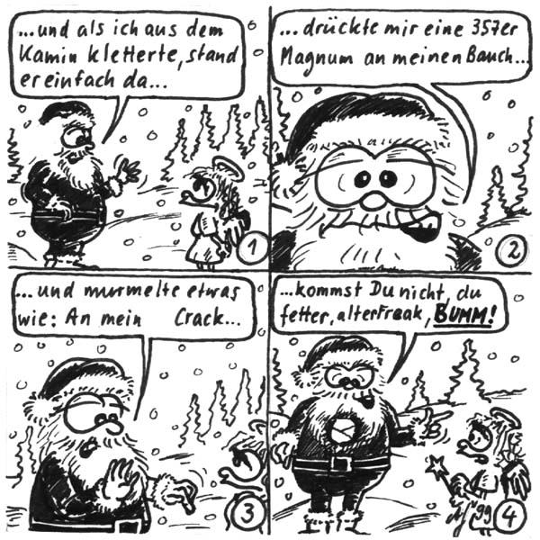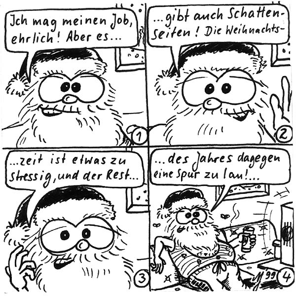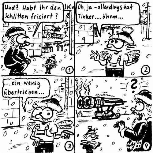Mal ehrlich, jeder von uns glaubt doch in Wirklichkeit an den Weihnachtsmann. Nur - wie lebt er eigentlich so? Kennt er auch Probleme? Nun, ich hoffe, daß diese kleine Cartoonserie ein paar dieser Fragen beantworten kann und ihm gleichzeitig ein wenig Verständnis für seinen wirklich harten Job wirbt... ![]() |