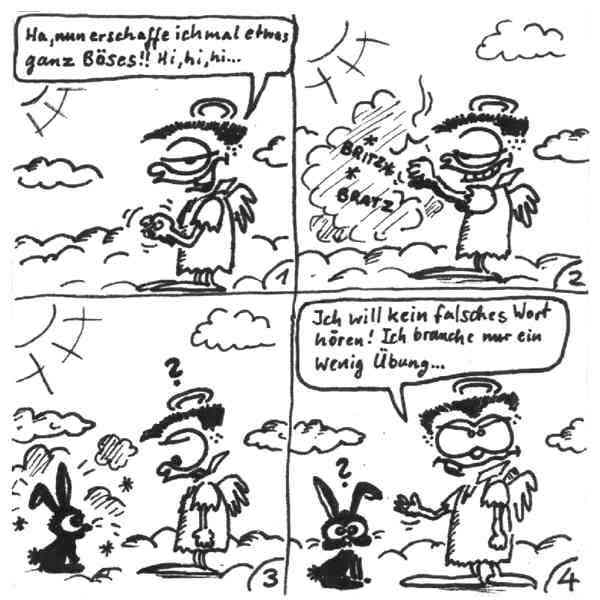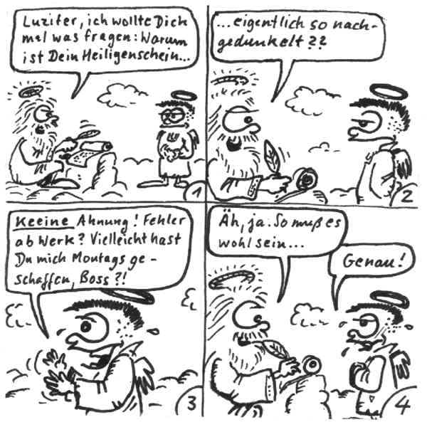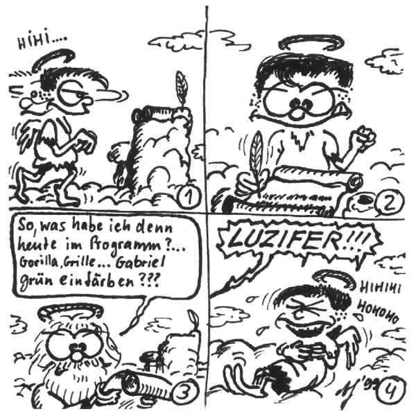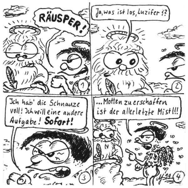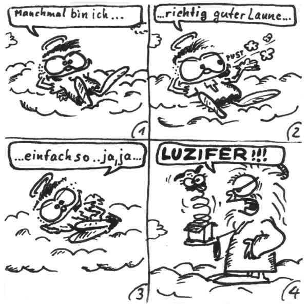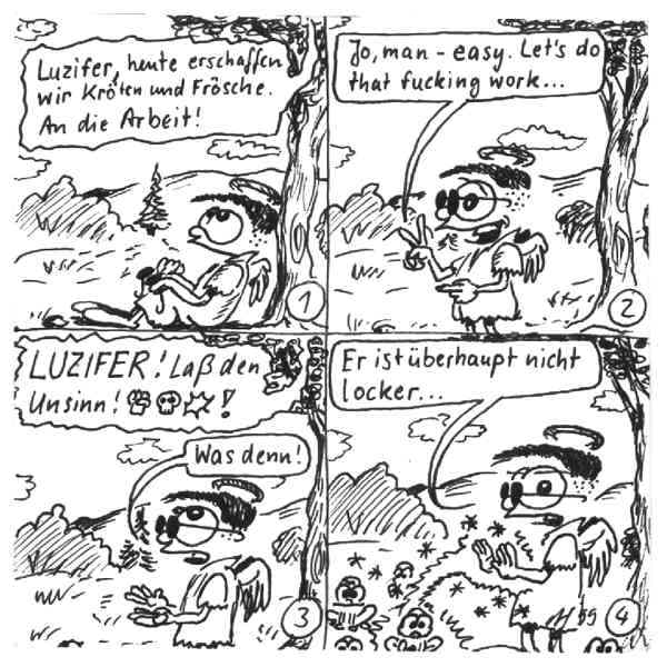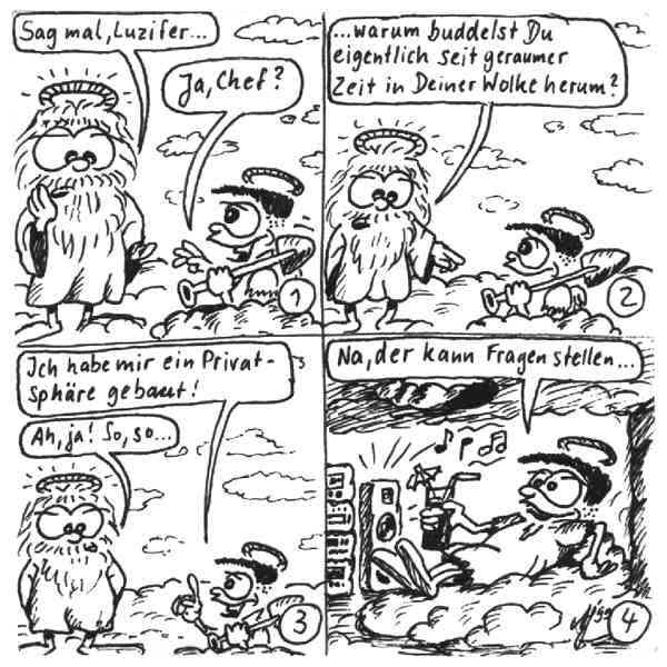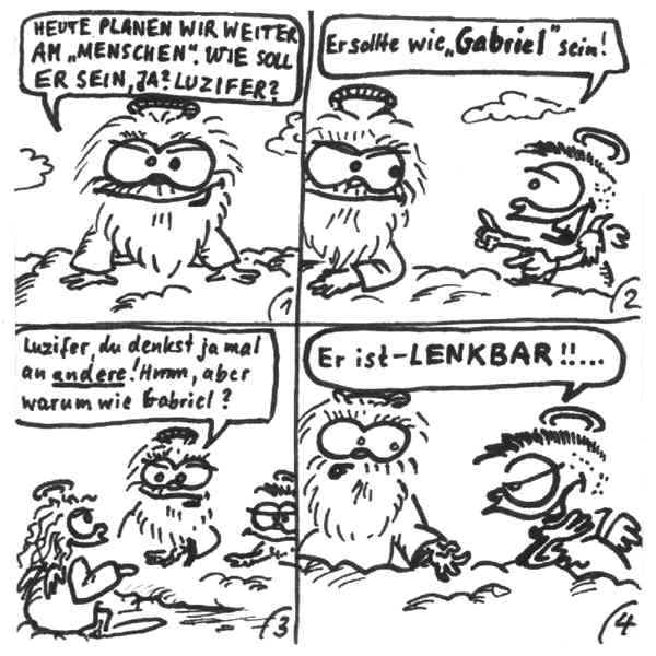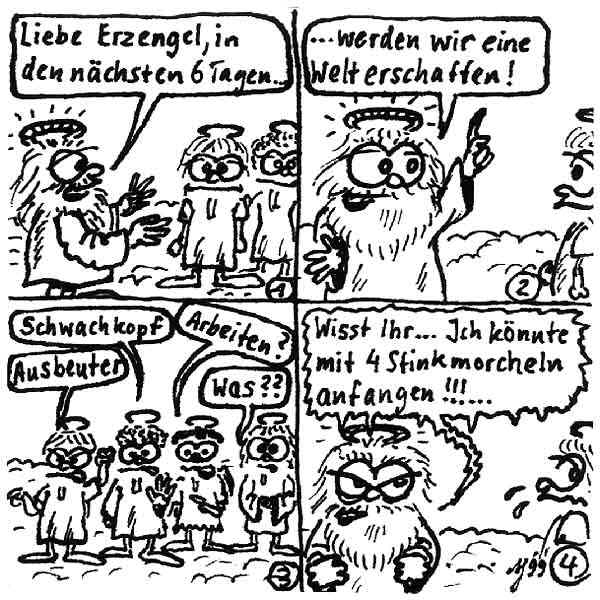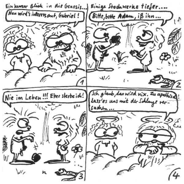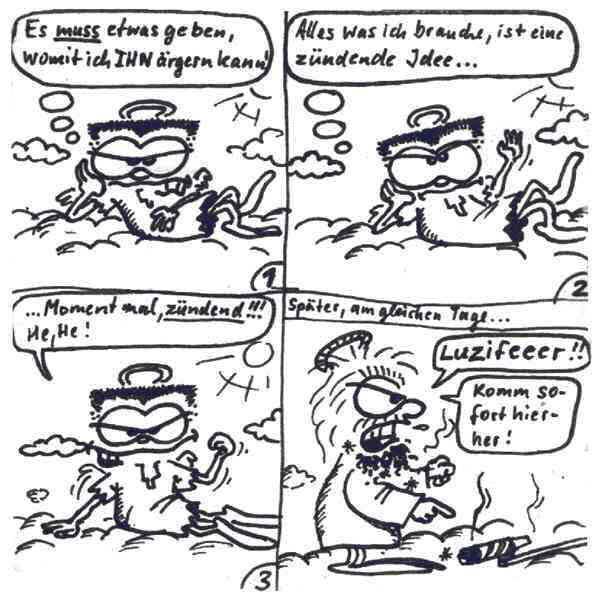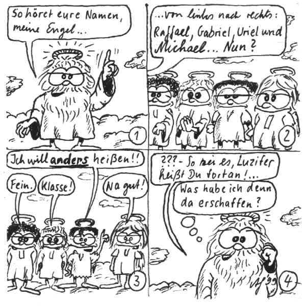 Diese Cartoon-Reihe ist mein Lieblingskind. Sie spielt in der Zeit zwischen dem absoluten Nichts und dem Sündenfall. Hauptfiguren sind: Gott, die vier Erzengel Gabriel, Raffael, Michael und Luzifer (eigentlich Uriel, aber so weiß man besser, wer gemeint ist...) und natürlich Adam und Eva. An dieser Stelle möchte ich mich bei dem Autor Jeremy Pascall bedanken, der mich mit seinen zwei Büchern: "Gott - Die entgültige Biographie" und "Satan - teuflische Memoiren" auf die Idee gebracht hat . Einfach göttlich...