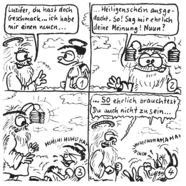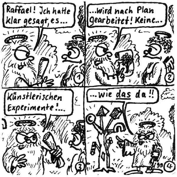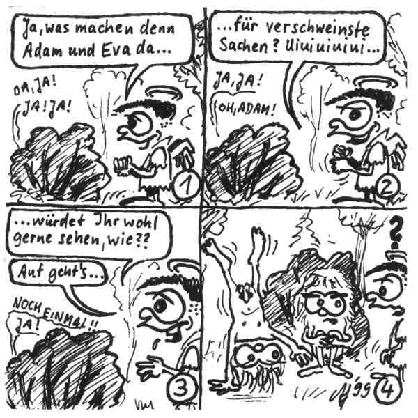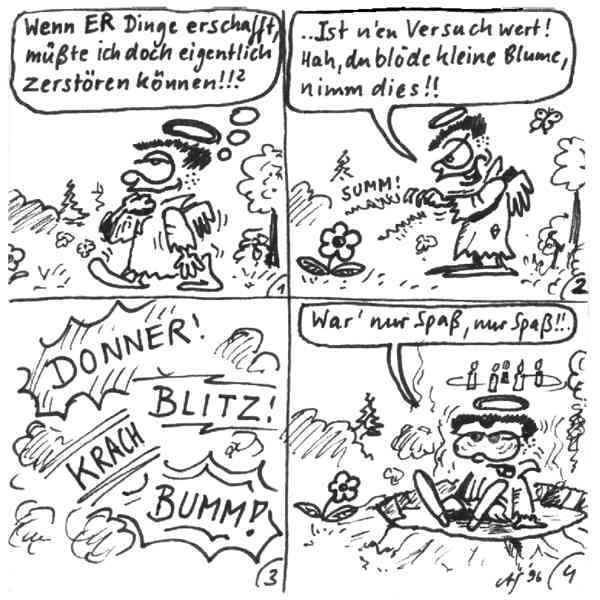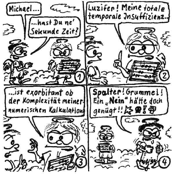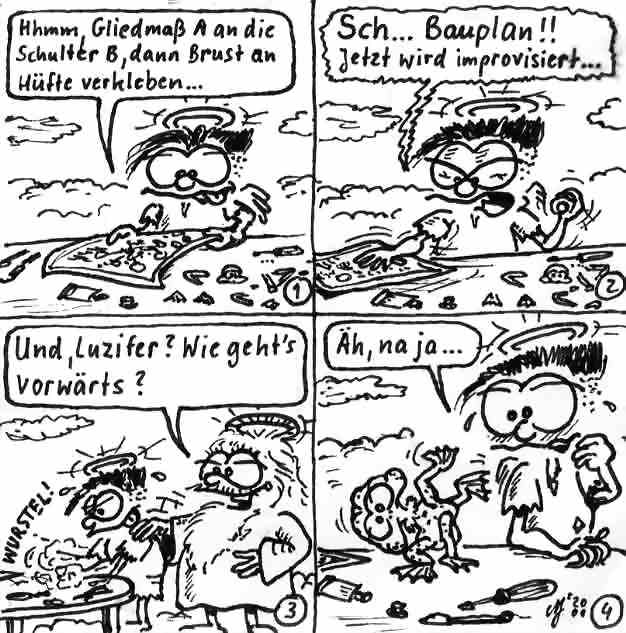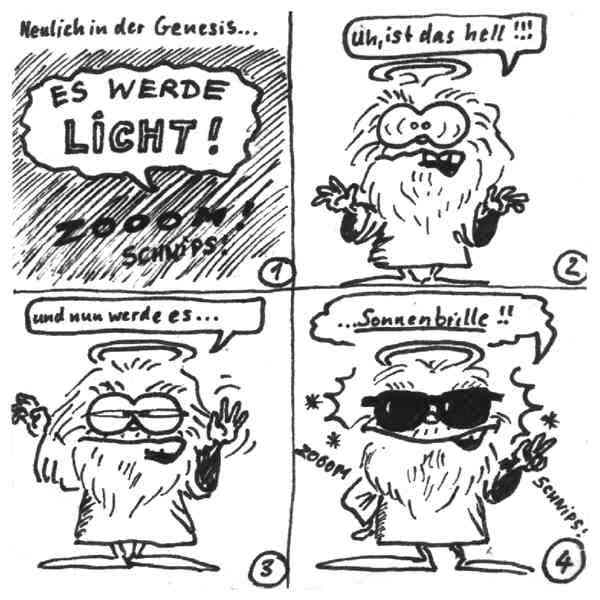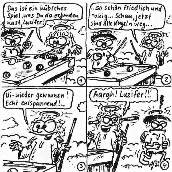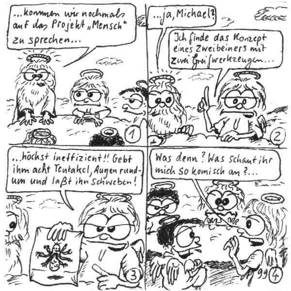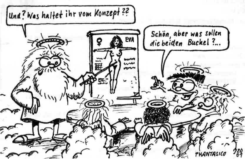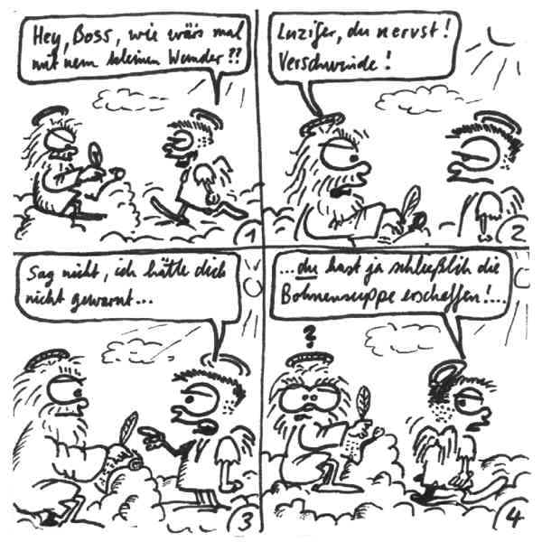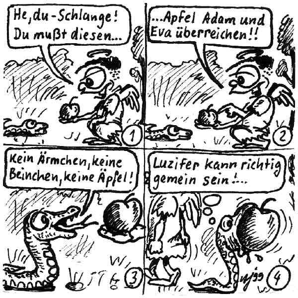 Diese Cartoon-Reihe ist mein Lieblingskind. Sie spielt in der Zeit zwischen dem absoluten Nichts und dem Sündenfall. Hauptfiguren sind: Gott, die vier Erzengel Gabriel, Raffael, Michael und Luzifer (eigentlich Uriel, aber so weiß man besser, wer gemeint ist...) und natürlich Adam und Eva. An dieser Stelle möchte ich mich bei dem Autor Jeremy Pascall bedanken, der mich mit seinen zwei Büchern: "Gott - Die entgültige Biographie" und "Satan - teuflische Memoiren" auf die Idee gebracht hat . Einfach göttlich...