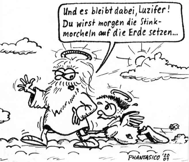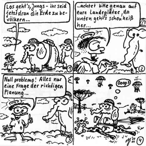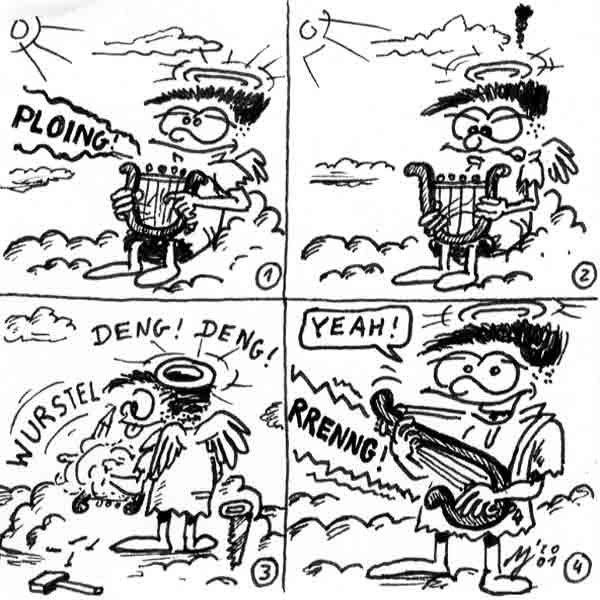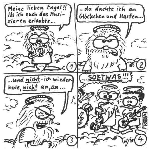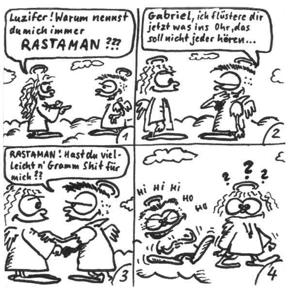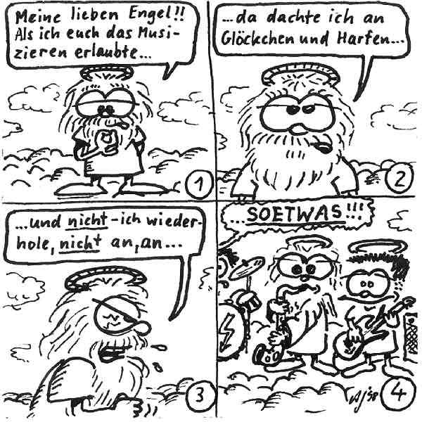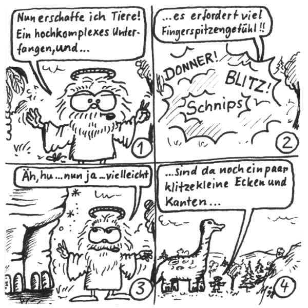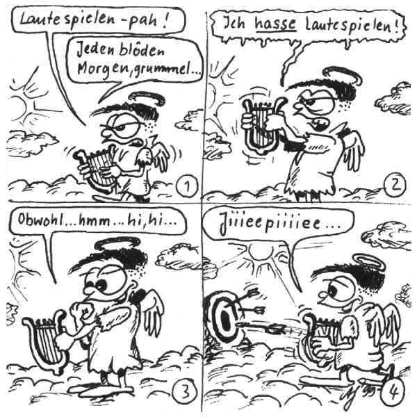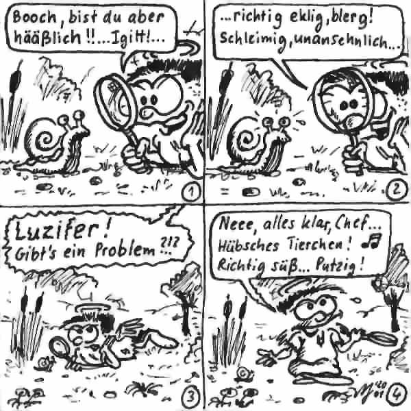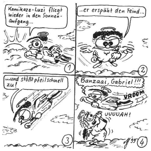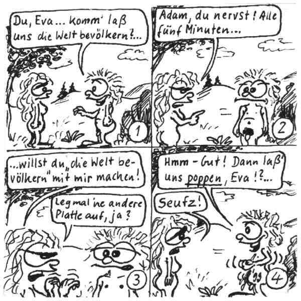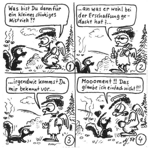 Diese Cartoon-Reihe ist mein Lieblingskind. Sie spielt in der Zeit zwischen dem absoluten Nichts und dem Sündenfall. Hauptfiguren sind: Gott, die vier Erzengel Gabriel, Raffael, Michael und Luzifer (eigentlich Uriel, aber so weiß man besser, wer gemeint ist...) und natürlich Adam und Eva. An dieser Stelle möchte ich mich bei dem Autor Jeremy Pascall bedanken, der mich mit seinen zwei Büchern: "Gott - Die entgültige Biographie" und "Satan - teuflische Memoiren" auf die Idee gebracht hat . Einfach göttlich...